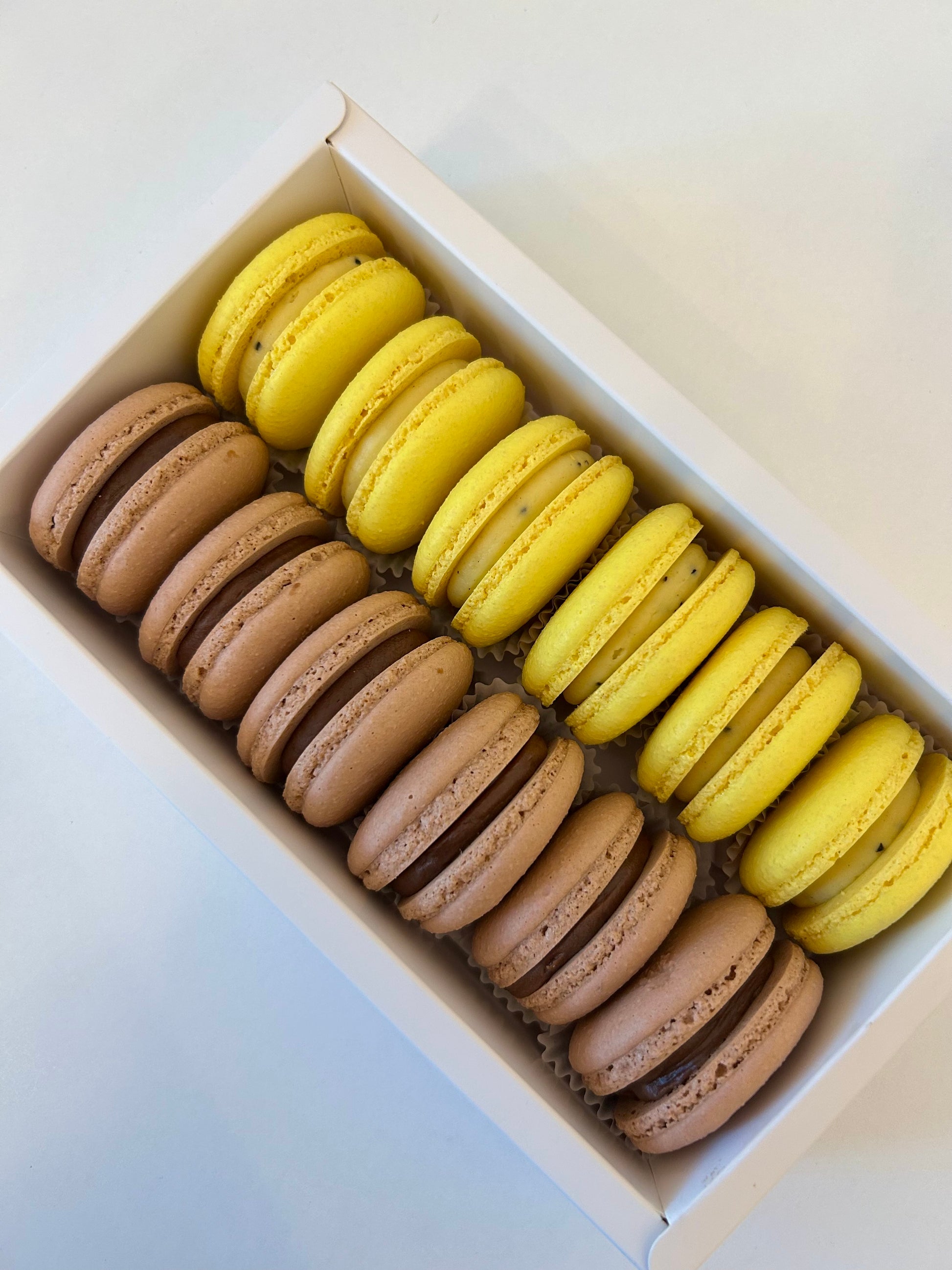 Indulge in a beautifully curated box of 12 handcrafted macarons, elegantly presented in a white box with a clear window and finished with a ribbon — perfect for gifting, celebrations, or a personal treat.